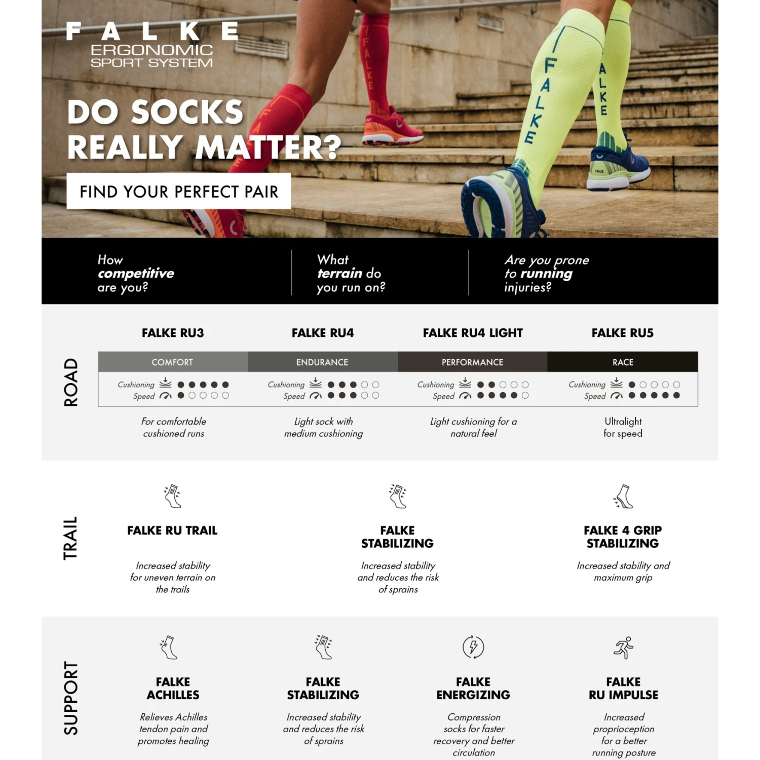 De “RU Trail” is de perfecte keuze voor hardlopen in het terrein en op oneffen terrein. Het stabiliseert de enkel met een ingebreid verband en minimaliseert zo het risico op verdraaiing. Het sneldrogende functionele materiaal houdt de voet droog, zelfs op natte paden. De medium-density padding zorgt voor de nodige demping en optimale bescherming bij een hoog schoencontact.